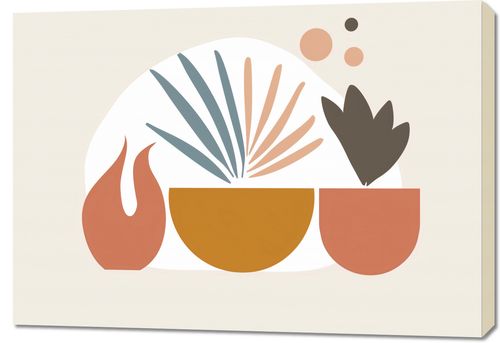 Obraz z serii boho zatytułowany Paleta Roślinna.Ten obraz łączy geometryczną prostotę z motywami roślinnymi, tworząc czystą i nowoczesną interpretację natury. Stonowana kolorystyka z akcentami pastelowych barw wprawia w stan relaksu i spokoju. Motywy roślinne, stylizowane na abstrakcyjne kształty, wyłaniają się z prostokątnych doniczek, tworząc harmonijną całość. Jest to idealny wybór dla tych, którzy cenią sobie spokój i przytulność w swoim domowym zaciszu. Obraz będzie pasował do przestrzeni życiowej urządzonej w duchu skandynawskim lub minimalistycznym, gdzie prostota formy idzie w parze z naturalnym pięknem. Może ozdobić ściany w salonach, sypialniach lub biurach, gdzie wprowadzi odrobinę naturalnej estetyki bez przytłaczania przestrzeni.