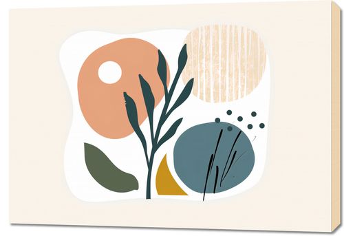 Obraz z serii boho zatytułowany Pastel Owoców.Obraz przedstawia stilizowany obraz natury, gdzie organiczne formy i kształty łączą się w nieoczywisty sposób. W kompozycji dominuje duża, pastelowa forma przypominająca owoce lub słońce, która kontrastuje z subtelnym tłem w delikatnych odcieniach beżu ozdobionym wertykalnymi liniami. Obok widnieją płynne, ciemnozielone liście oraz zaokrąglone, geometryczne formy w odcieniach szarości i musztardy, uzupełnione o subtelne graficzne akcenty. Obraz będzie pięknie komponował się w przestrzeniach poszukujących elementów natury w abstrakcyjnej, uproszczonej formie, idealnie nadając się do nowoczesnych salonów, kreatywnych przestrzeni pracy lub jako delikatny akcent w minimalistycznej sypialni.