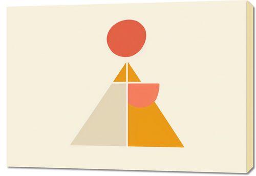 Obraz z serii boho zatytułowany Piramida Równowagi.Na obrazie widnieje uproszczona, ale wyrazista kompozycja geometryczna, składająca się z trójkąta podzielonego na mniejsze sekcje, półkola oraz kółka na szczycie. Kolorystyka utrzymana w pastelowych odcieniach beżu, pomarańczy i czerwieni, wprowadza poczucie ciepła i spokoju.Dzieło idealnie wpisuje się w minimalistyczne i nowoczesne przestrzenie, stanowiąc zarazem element medytacyjny jak i dekoracyjny. Dopełnieniem mogą być proste, drewniane ramy, które podkreślą naturalność prezentowanej formy. Jest to obraz, który może znaleźć swoje miejsce w domowym biurze, salonie, a nawet w przestrzeniach komercyjnych, takich jak kawiarnie lub poczekalnie.