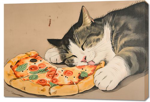 Obraz z serii wnętrza zatytułowany Pizza Dla Kota. Urocze przedstawienie kota w stanie głębokiego relaksu, delektującego się kawałkiem pizzy. Przewrotny humor i ciepło obrazu są podkreślone przez szczegółowe wykonanie, od realistycznej faktury sierści po apetycznie wyglądające plasterki pomidora i liście bazylii na pizzy. Kolory są żywe, ale nieprzesadzone, co nadaje plakatowi przyjemny dla oka, domowy charakter. To dzieło przyniesie uśmiech i doda uroku każdej kuchni czy jadalni, a także może być ciekawym akcentem w pizzerii lub kawiarni. Idealnie wpasuje się w miejsca, które chcą nadać swoim przestrzeniom ciepły, domowy nastrój z odrobiną humoru.