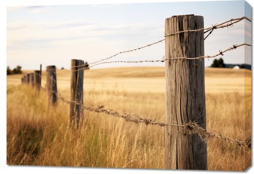 Obraz z serii pejzaże zatytułowany Płot na Polu. Obraz przedstawia rustykalny drewniany płot z drutem kolczastym, ciągnący się wzdłuż złocistego, zbożowego pola. Delikatne odcienie złota i brązu, w połączeniu z subtelnie rozmytym tłem, tworzą poczucie głębi i przestrzeni. Ten spokojny, wiejski krajobraz wprowadza atmosferę relaksu i odprężenia, idealnie nadając się do wnętrz inspirowanych naturą lub jako ukojenie dla zaganianych mieszkańców miast. Doskonały do salonu, jadalni lub jako element wypoczynkowej przestrzeni.