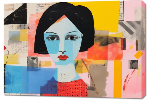 Obraz z serii abstrakcja zatytułowany Prześwit Wzroku przedstawia abstrakcyjny portret kobiety, skomponowany z różnorodnych elementów kolażu. Dynamiczna kompozycja łączy w sobie wyraziste kolory i tekstury, z fragmentami tekstu, geometrycznymi kształtami i abstrakcyjnymi formami. Centralną figurą jest twarz kobiety o prostych, ale silnych rysach, z kontrastującymi niebieską cerą, czarnymi włosami i czerwonymi ustami, co nadaje jej wyrazistości i głębi. Tło składa się z żywych żółtych i pomarańczowych plam, przeplatających się z chłodnymi błękitami i neutralnymi odcieniami, tworząc wrażenie różnorodności i dynamizmu współczesnego życia. Obraz ten może stanowić inspirujący element dekoracyjny w nowoczesnych przestrzeniach mieszkalnych, galeriach sztuki lub kreatywnych miejscach pracy, stymulujący wyobraźnię i refleksję nad naturą sztuki.