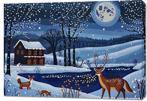 Obraz z serii abstrakcja zatytułowany Przyszła Zima. Obraz przedstawia malowniczą, zimową scenę w stylistyce folklorystycznej. Na obrazie dominują chłodne odcienie niebieskiego, tworząc nocny krajobraz pokryty śniegiem. Centralny motyw stanowi dom z oświetlonymi oknami, co nadaje scenie ciepły, przytulny akcent. Śnieg delikatnie opada na drzewa i dach domu, a pełnia księżyca rozświetla niebo, odbijając się w zamarzniętym strumieniu. Na pierwszym planie widać sylwetki zwierząt: dorosłego jelenia i młodego lisa, które dodają kompozycji naturalnego życia i ruchu. Tło przedstawia malownicze wzgórza i lasy, co współgra z idyllicznym, spokojnym nastrojem obrazu. Scena ta wywołuje uczucie spokoju i cichej radości, sprawiając, że plakat ten jest idealny do dekoracji wnętrz w zimowym okresie, dodając im ciepła i uroku.