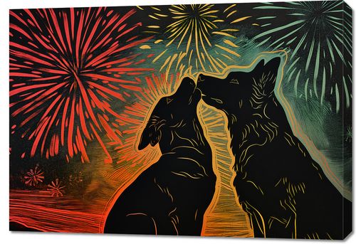 Obraz z serii abstrakcja zatytułowany Psi Uścisk. Przedstawia on dwie sylwetki psów, które wydają się być zwrócone ku sobie w gest podobny do uścisku, na tle intensywnie kolorowego nieba z fajerwerkami. Barwy od czerwieni po żółcie i zielenie tworzą tło, które wygląda jak nocne niebo w trakcie świętowania. Styl graficzny jest dynamiczny i pełen energii, a linie tworzące sylwetki psów są płynne i wyraziste. Ten obraz wyraża radość i nieodłączną więź pomiędzy zwierzętami, będąc doskonałym dodatkiem do wnętrz, gdzie chcemy podkreślić ciepło i pozytywne emocje.