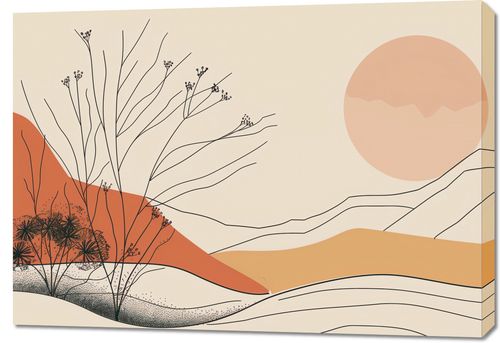 Obraz z serii boho zatytułowany Pustynna Wydma. Obraz ukazuje krajobraz z delikatnie zarysowanymi roślinami na tle łagodnych, pustynnych wydm. Spokojna kolorystyka, opierająca się na miękkich odcieniach beżu, pomarańczy i czerwieni, oddaje kojący klimat zmierzchu. W tle widoczne jest wielkie, ciepłe słońce, które rzuca złoty blask na całą scenę, nadając jej harmonijny charakter. Ten obraz będzie piękną dekoracją do wnętrz, które pragną wprowadzić elementy natury w połączeniu z minimalistycznym designem. Jego uspokajające barwy i proste linie idealnie wpasują się w przestrzenie takie jak sypialnie, salony, miejsca odpoczynku, czy nawet biura kreatywne, pragnące wykreować przestrzeń sprzyjającą relaksowi i inspiracji.