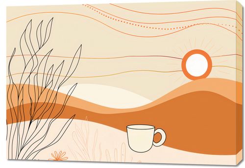 Obraz z serii minimalistyczne zatytułowany Ranna Pora. Obraz przedstawia stylizowany, spokojny krajobraz pustynny z wschodzącym słońcem, które emanuje ciepłem, barwiąc niebo w pastelowe odcienie. Ponad łagodnymi, falującymi wzgórzami widnieją delikatne linie, które mogą przypominać ciepłe prądy powietrza lub subtelne ozdoby. Na pierwszym planie znajduje się filiżanka kawy, umieszczona tak, jakby była częścią pustynnego terenu, co dodaje scenie element codziennego rytuału i spokoju. Obraz jest pełen ciepłych, ziemiście beżowych i pomarańczowych odcieni, które wprowadzają atmosferę relaksu i spokoju. Idealnie pasuje do przestrzeni wypoczynkowych, takich jak kawiarnie, salony, czy pokoje do odpoczynku, gdzie może pomóc stworzyć przytulne i spokojne otoczenie. Dzieło to z pewnością będzie przyciągać wzrok, będąc subtelny jednocześnie.