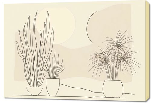 Obraz z serii minimalistyczne zatytułowany Roślinność w Pastelu. Obraz przedstawia trzy doniczki z roślinami o subtelnych, linearnych kształtach na tle geometrycznych form w pastelowych barwach beżu i bieli. Zarysowane linie roślin przypominają delikatne ruchy wiatru, dodając kompozycji lekkości i naturalnego rytmu. Tło obrazu jest stonowane, co pozwala na skupienie uwagi na wyrazistych kształtach roślin. Ten plakat idealnie wpasuje się w przestrzenie, które cenią sobie spokój i harmonię. Jego subtelna paleta barw i elegancka prostota czynią go doskonałym dodatkiem do wnętrz skandynawskich, zen czy nowoczesnych minimalistycznych, wnosząc do nich odrobinę natury i estetycznej przyjemności.