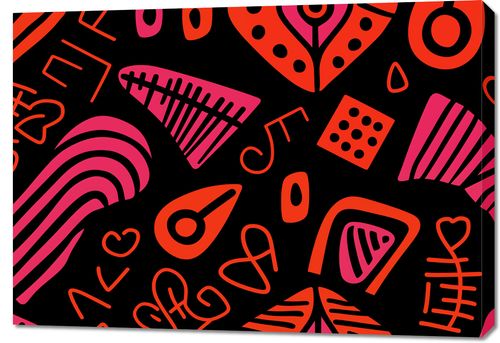 Obraz z serii abstrakcja zatytułowany Rytm Wzorów - pulsujące, energetyczne dzieło sztuki, które łączy w sobie abstrakcyjne kształty i wibrujące kolory na ciemnym tle. Wzory są zainspirowane żywiołowością muzyki i miejskiego życia, z nutami, sercami i innymi elementami graficznymi, które tworzą rytmiczny i wizualnie hałaśliwy krajobraz. Intensywne czerwienie i różowe akcenty kontrastują z głęboką czernią, nadając plakatowi wyrazistość i mocny charakter. To idealny wybór do nowoczesnych przestrzeni, które celebrują kreatywność i dynamiczność, takich jak studia projektowe, muzyczne bary czy urbanistyczne lofoty.