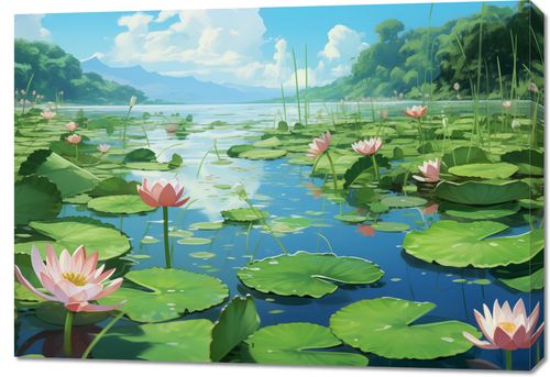 Obraz z serii natura zatytułowany Sielankowy Staw Lilii – piękna, pastelowa ilustracja przedstawiająca sielankową scenerię stawu pełnego kwitnących lilii wodnych. Delikatne odcienie różu i bieli kwiatów lilii harmonijnie kontrastują z żywą zielenią liści i spokojnym błękitem wody. W tle majestatycznie rozciągają się góry, a drzewa i roślinność wzdłuż brzegu stawu dopełniają obrazu spokoju i naturalnego piękna. Subtelne refleksy świetlne na powierzchni wody i dynamiczne pociągnięcia pędzla dodają kompozycji życia, tworząc poczucie głębi i przestrzeni. Ten obraz idealnie wpasuje się w przestrzenie, które pragną wprowadzić atmosferę relaksu i medytacyjnego spokoju.