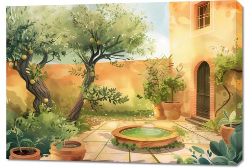 Obraz z serii abstrakcja zatytułowany Słoneczny Dzień. Obraz ukazuje idylliczny ogród w ciepły, słoneczny dzień. Widoczna jest część kamiennego patio otoczonego bujną roślinnością, z dojrzałymi cytrynami wiszącymi na gałęziach niewielkich drzew. W centrum kompozycji znajduje się dekoracyjny kamienny basen z delikatnym strumieniem wody. Na pierwszym planie widać donice z różnorodnymi roślinami, które dodają scenie domowego ciepła. Jaskrawość słońca jest złagodzona przez liście drzew, tworząc wzorzyste cienie na płytach chodnika. Architektura w tle, z żółtymi ścianami i ciemnymi drewnianymi drzwiami, współgra z naturalną paletą kolorów ogrodu. Atmosfera obrazu jest spokojna i relaksująca, sugerująca miejsce ucieczki i odpoczynku.