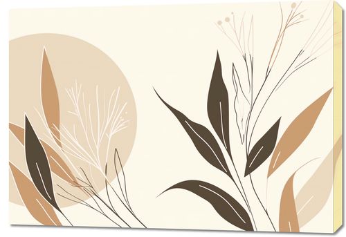 Plakat z serii minimalistyczne zatytułowany Splątana Wizja. Dzieło to przedstawia stylizowane rośliny w spokojnych, ziemiście ciepłych kolorach, tworząc poczucie spokoju i harmonii. Delikatne linie i płynne kształty przywodzą na myśl spokojny dzień na łonie natury. Plakat ma wyrafinowany i jednocześnie prosty charakter, który łączy w sobie elementy natury z minimalistycznym designem.Ten obraz będzie idealnym wyborem dla wnętrz, w których panuje atmosfera relaksu i spokoju, takich jak joga lub spa. Jego łagodne barwy i naturystyczne motywy są idealne do przestrzeni, gdzie priorytetem jest spokój umysłu i harmonia z otaczającym środowiskiem, takich jak salon, sypialnia, czy miejsce do medytacji.