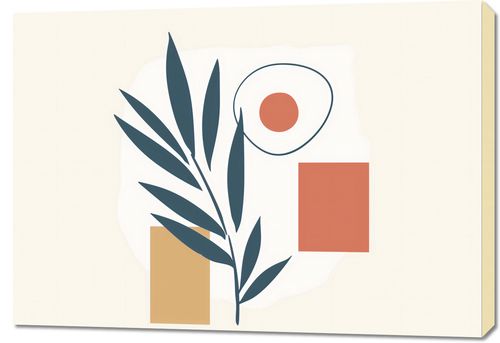 Obraz z serii boho zatytułowany Splot Natury.Obraz to subtelne połączenie abstrakcyjnych form i motywów przyrodniczych. Ciepłe, stonowane kolory tworzą delikatne tło dla wyrazistych, ciemnozielonych liści. Geometryczne kształty, w tym okrąg z centralnie umieszczonym punktem, przypominają stylizowane oko, które wraz z prostokątem w ciepłym kolorze tworzy kompozycję pełną spokoju i równowagi.To dzieło doskonale wpasuje się w przestrzenie, które łączą współczesny design z elementami naturalnymi, takie jak jasne salony, przestronne studia, czy strefy relaksu w domach i miejscach publicznych. Prosta paleta kolorów i elementy roślinne mogą wprowadzić wyciszającą atmosferę do sypialni lub gabinetów, gdzie design współgra z funkcją i tworzy przestrzeń do odprężenia i inspiracji.