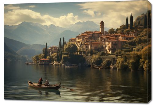 Obraz z serii pejzaże zatytułowany Spokojna Nostalgia, ten urzekający pejzaż przenosi nas do sielankowej wioski nad jeziorem, gdzie czas zdaje się płynąć wolniej. Łagodne światło rozlewające się nad architekturą wioski i gładką powierzchnią wody tworzy poczucie ciepła i spokoju. Para przemieszczająca się łodzią dodaje element ludzki, harmonijnie wpisując się w krajobraz. To dzieło sztuki idealnie nadaje się do przestrzeni, które mają na celu wprowadzenie atmosfery spokoju i refleksji, takich jak biblioteki, poczekalnie lub prywatne gabinety, zapewniając odprężającą ucieczkę od codziennego zgiełku.