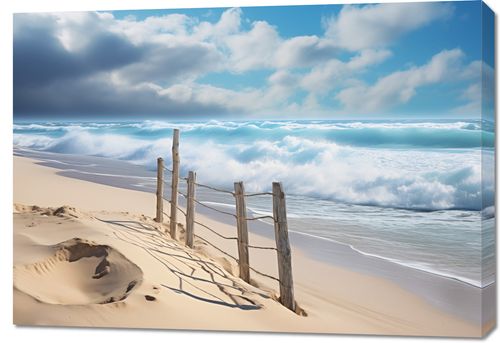 Obraz z serii pejzaże zatytułowany Szepty Oceanu przedstawia dziką, nieokiełznaną siłę natury, uchwyconą w potężnych, spienionych falach oceanu bijących o brzeg. Stare, drewniane słupki, połączone powykręcanym sznurem, dodają kompozycji surowego charakteru i poczucia trwałości w obliczu nieskończonej przestrzeni wody. Piasek, modelowany przez wiatr, tworzy delikatne wzory, które kontrastują z mocy i wielkości oceanu. Ten obraz jest kwintesencją siły i spokoju, idealny do przestrzeni współczesnych, minimalistycznych lub tych o morskim motywie, gdzie może inspirować do refleksji nad nieustającą zmiennością i majestatem natury.