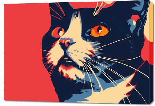 Obraz z serii abstrakcja zatytułowany Szok. Obraz przedstawia zbliżenie na twarz kota w stylizowanej, graficznej formie. Przeważającym kolorem jest intensywny czerwony, który stanowi tło dla sylwetki kota. Wyraziste, żółte oczy zwierzęcia przyciągają uwagę, a ich niemal hipnotyzujący wzrok jest skierowany ku widzowi. Wizerunek kota jest zróżnicowany kolorystycznie: od ciemnych odcieni, poprzez szarości, aż po żywe akcenty błękitu i pomarańczy, które dodają dynamiki i głębi. Detale takie jak wąsy i futro są wyraźnie zaznaczone białymi i niebieskimi liniami, co nadaje ilustracji ruch i teksturę. Całość kompozycji ma współczesny, prawie popartowy charakter, przyciągając wzrok i wzbudzając emocje. Jest to dzieło, które mogłoby znaleźć miejsce w nowoczesnych przestrzeniach, podkreślając miłość do zwierząt i sztuki.