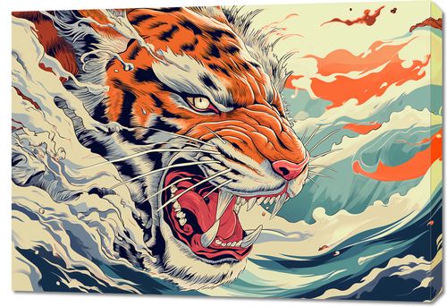 Obraz z serii motywy wschodnie zatytułowany Tygrys Na Fali. Ilustracja przedstawia potężnego tygrysa wyłaniającego się z wzburzonych fal oceanu, z paszczą szeroko otwartą w głośnym ryku. Styl graficzny, z wyrazistymi liniami i żywymi kolorami, przypomina klasyczne azjatyckie sztuki, łącząc w sobie elementy tradycji i nowoczesności. Dynamiczne pociągnięcia pędzlem i kontrastowe kolory podkreślają siłę i dzikość sceny. Obraz ten będzie idealnym akcentem w przestrzeniach, które celebrują energię i życiową siłę, takich jak sale do ćwiczeń, studia artystyczne czy nowoczesne biura.