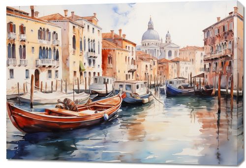 Obraz z serii pejzaże zatytułowany Wenecka Impresja, przedstawia malowniczą scenę kanałów Wenecji. Styl przypominający akwarelę, z miękkimi pociągnięciami i pastelowymi refleksami na wodzie, uchwycił zarówno spokój, jak i żywą atmosferę tego zabytkowego miasta. Łodzie i gondole są cicho przywiązane do nabrzeża, a w tle wznosi się charakterystyczna sylwetka bazyliki. Ten obraz przyciąga uwagę swoją grą światła i koloru, sugerując historie i tajemnice tkwiące w sercu Wenecji. Idealnie sprawdzi się jako element dekoracyjny w przestrzeniach, które pragną przywołać elegancję i historyczną głębię, takich jak salony, studia, biura, a nawet restauracje, które chcą dodać odrobinę włoskiego charakteru do swojego wnętrza.