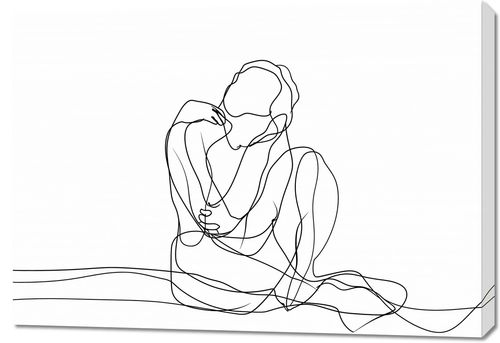 Obraz z serii wnętrza zatytułowany Zgarbienie. Obraz przedstawia minimalistyczny, jednoliniowy rysunek siedzącej postaci. Jest to przykład sztuki line art, gdzie cała forma jest zredukowana do jednej, ciągłej linii, która tworzy zarówno zewnętrzny kontur postaci, jak i wewnętrzne detale ciała i ubioru. Postać wydaje się zatopiona w myślach, z głową opartą na dłoni, co sugeruje introspekcję lub głębokie zamyślenie. Prosta elegancja tej pracy polega na jej zdolności do przekazywania emocji i postawy bez nadmiernego skomplikowania formy. Czyste tło podkreśla subtelność i skupienie kompozycji. Taki obraz może idealnie wpasować się w nowoczesne, ascetyczne wnętrza, gdzie może stanowić spokojny, ale wyrazisty akcent artystyczny.