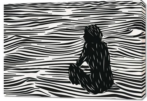 Obraz z serii abstrakcja zatytułowany Złożone Fluidalne Linie. Plakat przedstawia abstrakcyjną, czarno-białą ilustrację, w której kontrastowe, fluidalne linie tworzą efekt wzburzonej powierzchni wody. Na tej dynamicznie zarysowanej powierzchni wyłania się sylwetka osoby, która siedzi w skupieniu, z głową zwróconą w stronę obserwatora. Postać jest zredukowana do ciemnych, monochromatycznych bloków, co nadaje jej minimalistyczny, ale wyrazisty charakter. Sylwetka człowieka jest wyraźnie zarysowana i stanowi centralny punkt kompozycji, a jej kontury płynnie wtapiają się w abstrakcyjne tło. Ten artystyczny obraz łączy prostotę z głębią, sugerując kontemplację lub introspekcję. Jego prosta paleta barw i silne linie mogą przyciągać uwagę i inspirować do refleksji nad spokojem i złożonością ludzkiej natury.