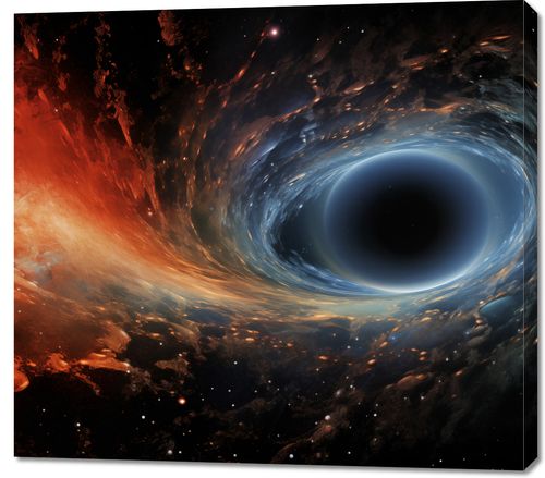 Obraz z serii wnętrza zatytułowany Bezkres Wszechświata przedstawia imponujący obraz czarnej dziury zanurzonej w kosmicznym pyłowym maelstromie. Czarnej dziury potężne pole grawitacyjne zaciera granice rzeczywistości, zakrzywiając i rozciągając światło z otaczającej galaktyki, tworząc hipnotyzujący wir kolorów - od głębokich odcieni czerwieni i pomarańczy po spokojne błękity i szarości. Wokół tej kosmicznej enigmy roztacza się pasma gorącego gazu i gwiazd, a w tle migocą odległe światła innych galaktyk. Ta dramatyczna i pełna kontrastów scena przywołuje nieskończoną ciekawość i podziw wobec niezgłębionych tajemnic Wszechświata. Obraz ten jest idealny dla miłośników astronomii, jako edukacyjny element w salach klasowych, czy jako zjawiskowa dekoracja w nowoczesnych przestrzeniach mieszkalnych, zachęcający do refleksji nad wielkością i pięknem kosmosu.