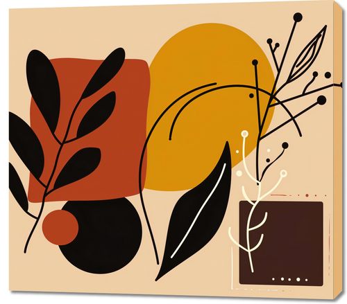 Plakat z serii minimalistyczne zatytułowany Ciepłe Kontury. Grafika przedstawia bogatą kompozycję stylizowanych roślin i abstrakcyjnych kształtów, utrzymaną w ciepłej palecie brązów, pomarańczy i ochry, z akcentami kontrastującej czerni. Delikatne linie dodają delikatności i subtelności, co sprawia, że praca emanuje naturalnym spokojem i elegancją. Obraz ten idealnie wkomponuje się w wnętrza, które cenią sobie ciepło i komfort, takie jak przytulne salony, jadalnie czy sypialnie. Dzięki swoim ziemistym tonom świetnie pasuje również do przestrzeni o naturalnym wystroju, wzbogacając je o elegancki, artystyczny akcent.