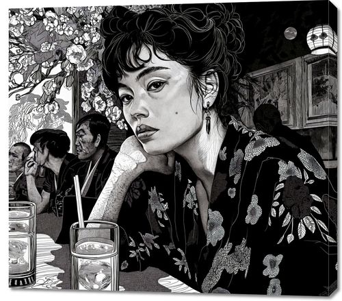 Obraz z serii motywy wschodnie zatytułowany Czarne Kimono. Przedstawia on czarno-białą scenę w restauracji, w której centralną postacią jest młoda kobieta o intensywnym spojrzeniu, ubrana w tradycyjny, kwiecisty kimono. Jej postać wyróżnia się na tle pozostałych gości, a szczegółowa grafika podkreśla wyraźne detale jej stroju i delikatnych rysów twarzy. Tło, zdobione motywem kwiatowym, nadaje głębi i kontekstu kulturowego, a całość kompozycji wywołuje atmosferę introspekcji i spokoju. Ten obraz idealnie nadaje się do wnętrz, które chcą oddać hołd klasycznej estetyce Dalekiego Wschodu lub po prostu wprowadzić element zastanowienia i piękna. Doskonale wpasuje się w przestrzenie takie jak salon, gabinet, a nawet miejsca publiczne, które pragną zapewnić swoim gościom wizualny odpoczynek i chwilę zadumy.