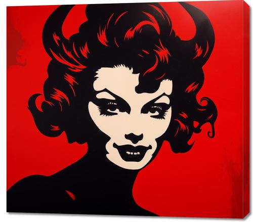 Obraz z serii pop art zatytułowany zatytułowany Czerwona Diablica. Na obrazie dominuje stylizowany portret kobiety w kontrastowych kolorach – głęboka czerń i intensywna czerwień tworzą silny wizualny kontrast, który przyciąga wzrok i intryguje. Wizerunek jest wyrazisty i graficzny, z mocnymi liniami i zredukowanym detalem, co nadaje mu nowoczesnego, prawie komiksowego charakteru. Kobieta jest przedstawiona z subtelnym uśmiechem i zmysłowym spojrzeniem, co nadaje jej tajemniczy i prowokujący charakter. Tło w jednolitym, żywym czerwonym kolorze podkreśla silną obecność postaci i jej niezaprzeczalny wpływ na otoczenie. Ten obraz jest hołdem dla klasycznej piękności i siły kobiecego wyrazu, idealnym dla przestrzeni, które pragną dodać odważnego stylu i charakteru.