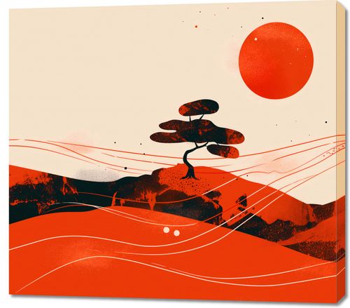 Obraz z serii minimalistyczne zatytułowany Czerwone Pustynne Pejzaże. Praca artystyczna przedstawia stonowany, lecz intensywny krajobraz z dominującymi czerwieniami i pomarańczami, z sylwetką charakterystycznego drzewa na pierwszym planie, co może sugerować inspiracje krajobrazami Afryki lub Australii. Ten obraz to świetny wybór dla wnętrz inspirowanych przyrodą i podróżami, przynoszących element globalnej wędrowki do domowego zacisza. Może dodać dramatyzmu i życia dużym, otwartym przestrzeniom, takim jak salon czy hol.