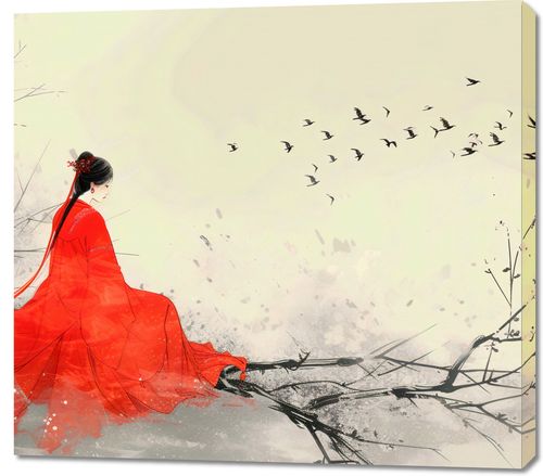 Obraz z serii motywy wschodnie zatytułowany Diva Na Gałęzi. Obraz przedstawia eteryczną scenę utrzymaną w delikatnej palecie barw z przewagą odcieni szarości i bieli, która kontrastuje z wyrazistą czerwienią. Na pierwszym planie widzimy postać kobiety w tradycyjnym, czerwonym stroju, z eleganckim uczesaniem i ozdobami we włosach, co sugeruje kulturalne lub historyczne znaczenie ubioru. Siedzi ona na gałęzi drzewa, a jej sukienka płynnie przechodzi w linie, które mogą symbolizować wiatr lub wodę, dodając grafice dynamiki. Tło jest stonowane i minimalistyczne, z subtelnymi plamami farby tworzącymi delikatną atmosferę. Nad sceną unosi się stado ptaków, które wzbija się do lotu, co może symbolizować wolność lub przejście. Całość kompozycji emanuje spokojem, melancholią i pięknem natury, a także może sugerować opowieść lub głębsze znaczenie skryte w postaci kobiety i jej połączeniu z otoczeniem.