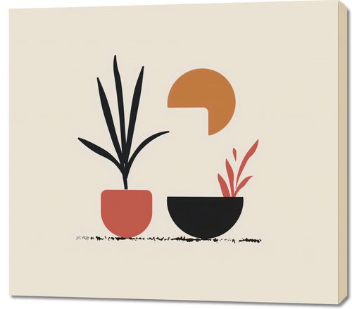 Obraz z serii boho zatytułowany Domowy Ogród. Obraz łączy proste, geometryczne formy roślin z ciepłą kolorystyką, tworząc przytulny obraz domowego ogrodu. Czerwony i czarny wazon z roślinnością wyrastają nad delikatną linia ziemi, przywołując obrazy spokojnego wnętrza. Niedokończony półksiężyc w kolorze pomarańczowym dodaje kompozycji delikatności i podkreśla domową atmosferę. Dzieło doskonale nadaje się do miejsca, które ma być oazą spokoju i relaksu, takiego jak sypialnia lub cichy kącik do czytania. Jego proste i spokojne kolory mogą również przynieść harmonię do miejsca pracy lub studiowania, promując skupienie i spokój.