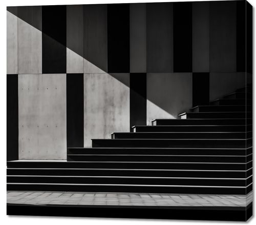Obraz z serii pejzaże zatytułowany Geometria w Architekturze. Zjawiskowy kontrast światła i cienia na geometrycznych formach stwarza iluzję głębi i perspektywy, zachęcając widza do zadumy nad interakcją przestrzeni i światła. Czyste linie i wyraźne kontrasty doskonale komponują się z nowoczesnymi, minimalistycznymi oraz industrialnymi wnętrzami. Idealny dla przestrzeni biurowych, loftów oraz jako element dekoracyjny w galeriach sztuki współczesnej.