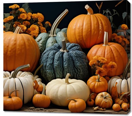 Obraz z serii natura zatytułowany Jesienne Urodzaje przedstawia bujne bogactwo jesieni. Centralne miejsce zajmuje soczysta, pomarańczowa dynia, królowa jesieni, otoczona przez różnorodność jej barwnych odmian. Niebieskawe i białe dynie tworzą wyjątkowy kontrast, a wszystko to uzupełnione jest przez złociste i burgundowe chryzantemy, które dodają kompozycji ciepła i głębi. Całość osadzona jest na tle w klasycznych, ciemnych odcieniach, co podkreśla elegancję i dojrzałość sezonu. Obraz ten idealnie wpasuje się w przestrzeń kuchni lub jadalni, dodając jej charakteru oraz ciepłego, domowego klimatu. Doskonale odnajdzie się także w przestrzeniach takich jak winiarnie czy restauracje serwujące sezonowe dania, gdzie podkreśli bogactwo i obfitość jesiennej palety smaków.