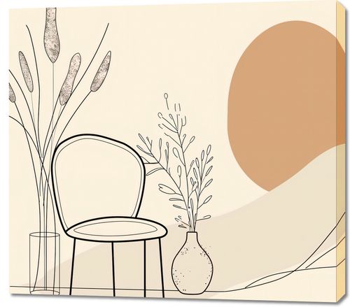 Obraz z serii boho zatytułowany Kącik Spokoju. Obraz prezentuje delikatny, linearny rysunek wnętrza, gdzie w centrum znajduje się eleganckie krzesło umieszczone obok stolika z wazonem i wysokimi, smukłymi roślinami. W tle, duża, okrągła forma w ciepłym, terra-cotta kolorze nadaje całości miękkiego, przytulnego charakteru. Linearna, subtelna paleta barw oraz gra cieni i światła tworzy atmosferę relaksu i wyciszenia. Ten obraz będzie doskonałym wyborem do dekoracji wnętrza, które ma być przestrzenią do odpoczynku i regeneracji. Jego prostota i elegancja sprawią, że doskonale odnajdzie się w salonach, pokojach do czytania, gabinetach czy medytacyjnych kącikach, wprowadzając spokojny i zbalansowany nastrój.