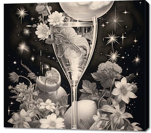 Obraz z serii wnętrza zatytułowany Kosmiczny Eliksir. Niesamowita kompozycja przedstawiająca kieliszek, z którego wylewa się galaktyczny nektar, otoczony kwiatami i roślinami w monochromatycznych barwach. Centralnym punktem jest lśniąca pełnia księżyca, której blask odbija się w szkle, tworząc atmosferę tajemnicy i magii. Gwiazdy migoczą w tle, nadając całości głębokiego, nieskończonego wymiaru. Delikatne linie i szczegóły graficzne wzbogacają kompozycję, czyniąc ją idealnym wyborem do nowoczesnych salonów, galerii sztuki oraz miejsc o tematyce astronomicznej.