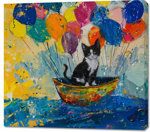 Obraz z serii abstrakcja zatytułowany Kot na Łodzi. Przedstawia on małego, czarno-białego kota siedzącego w malutkiej, kolorowej łódce, unoszącej się na żywych, błękitnych falach. Nad łódką unosi się bujny klaster jasnych, kolorowych balonów, które dodają obrazowi elementów wesołości i lekkości. Praca jest pełna energii, z widocznymi na całej powierzchni obrazu śladami energicznych pociągnięć pędzlem i plam farby, co nadaje dziełu nieco abstrakcyjny i ekspresyjny charakter. Ta mieszanka realistycznych i fantastycznych elementów tworzy ciepłą i zapadającą w pamięć scenę, która może wywoływać uśmiech i poczucie radości.