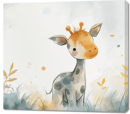 Obraz z serii wnętrza zatytułowany Mała Żyrafka. Uroczy obraz przedstawia młodą żyrafę o łagodnym spojrzeniu, wyłaniającą się z akwarelowej mgły pastelowych barw. Delikatne krople farby i subtelne linie tworzą atmosferę czystości i spokoju, nadając dziełu ciepły i relaksujący nastrój. Ten obraz, emanujący dziecięcą niewinnością i ciekawością świata, będzie idealnym dodatkiem do przestrzeni dziecięcej, takiej jak pokoje maluchów, przedszkola lub miejsca oczekiwania w placówkach pediatrycznych, zachęcając małych i dużych do marzeń i odkrywania piękna przyrody.