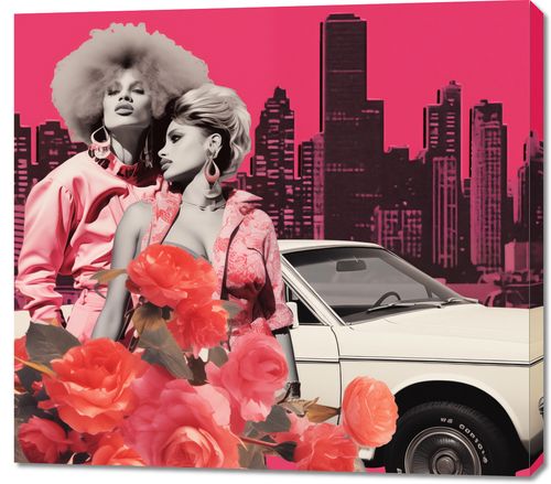 Obraz z serii pop art zatytułowany Metropolitalne Divy. Ta stylowa kompozycja łączy dynamikę miejskiego życia z vintage glamour, prezentując dwie kobiety w modnych strojach w tonacji różu, które emanują siłą i elegancją. Ich fryzury i dodatki nawiązują do lat 70. i 80., wprowadzając do obrazu powiew nostalgi. W tle widoczne są charakterystyczne dla wielkiego miasta sylwetki drapaczy chmur, wszystko utrzymane w wyrazistej, różowej kolorystyce, która nadaje plakatowi wyjątkowego charakteru. Na pierwszym planie, między postaciami, widnieje klasyczny samochód i bujny kwiat róż, dodający kompozycji romantycznej aury. Idealny dla wnętrz inspirowanych modą retro oraz dla miłośników miejskiego sznytu.