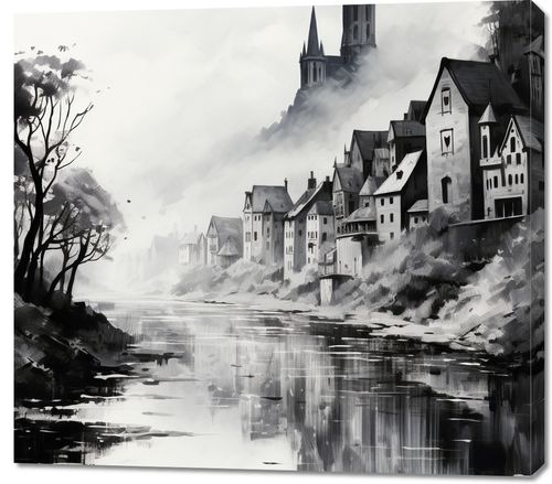 Obraz z serii pejzaże zatytułowany Mglisty Refleks. Misterne pociągnięcia pędzla przedstawiają starą wieś schowaną w mrocznych zakątkach gór, z dominującymi wieżami kościoła wznoszącymi się nad nią. Mgła otulająca krajobraz i odbicie w spokojnej wodzie tworzą atmosferę tajemniczości i zadumy. Monochromatyczna paleta barw dodaje głębi i intensywności całemu obrazowi, czyniąc go idealnym wyborem dla klasycznych salonów oraz miejsc takich jak kawiarnie o historycznym charakterze czy ekskluzywne kluby dyskusyjne.