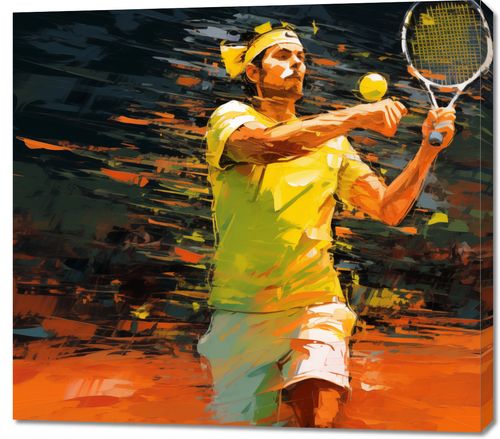 Obraz z serii abstrakcja zatytułowany Mistrzowski Serwis. Na tym żywiołowym dziele sztuki widzimy sylwetkę tenisisty w pełnym ruchu, wykonującego potężny serwis. Stylizacja obrazu przypomina impresjonistyczne pociągnięcia pędzla z żywymi plamami farby, które tworzą dynamiczny, prawie abstrakcyjny obraz akcji na korcie tenisowym. Barwy, od ciepłych żółci i pomarańczy do intensywnych cieni, podkreślają energię i pasję sportowej rywalizacji. To dzieło sztuki oddaje siłę, skupienie i elegancję tenisowej gry, będąc idealnym akcentem dla przestrzeni sportowych oraz dla miłośników i entuzjastów tenisa.