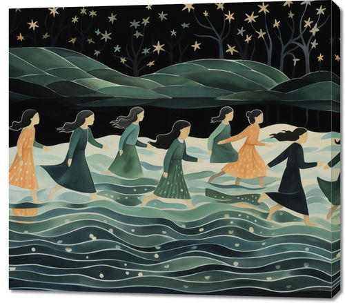 Obraz z serii wnętrza zatytułowany Nocna Procesja, przedstawia sylwetki kobiet, idących w rytmicznym ruchu przez wody, pod tajemniczym, gwiaździstym niebem. Styl obrazu, z płynnymi liniami i miękkimi pastelowymi kolorami, tworzy uczucie spokoju i onirycznej atmosfery. Postacie są przedstawione w ruchu, z włosami rozwianymi przez nocny wiatr, co dodaje dziełu poczucia tajemnicy i ruchu. Ten obraz idealnie nadaje się do wnętrz, które chcą wyrazić poczucie spokoju, introspekcji oraz kobiecej siły i solidarności, takich jak prywatne biblioteki, pokoje medytacyjne, a także przestrzenie publiczne, które pragną inspirować swoich gości do głębszego zastanowienia się nad otaczającym ich światem.