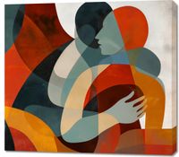 Obraz z serii abstrakcja zatytułowany Objęcia. Artystyczne przedstawienie dwóch postaci w uścisku, z wyraźnymi, płynnymi liniami i bogatą paletą kolorystyczną od ciepłych pomarańczy po chłodne odcienie błękitu i szarości. Grafika ta łączy abstrakcję z emocjonalną głębią, sugerując intymność i ciepło relacji. Idealnie komponuje się w nowoczesnych przestrzeniach mieszkalnych lub jako wyrazisty akcent w kreatywnych biurach. Ten obraz może również znaleźć miejsce w galeriach sztuki oraz w pomieszczeniach przeznaczonych do medytacji i refleksji, zachęcając do zastanowienia nad ludzką bliskością i uczuciami.