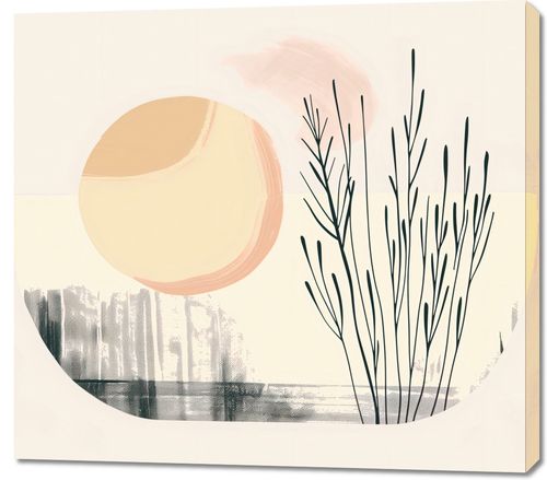 Obraz z serii boho zatytułowany Pastelowy Wschód. Obraz ukazuje subtelny, linearny rysunek roślinności na tle dużego, pastelowego słońca i delikatnie zaznaczonych elementów krajobrazu. Kompozycja w pastelowych, ciepłych barwach tworzy wrażenie spokojnego wschodu słońca, który rozświetla delikatne kontury roślin i miękkie formy w tle. Obraz ten idealnie wpasuje się do wnętrz o stonowanej kolorystyce, gdzie może dodać odrobinę ciepła i subtelnego charakteru. Doskonale nadaje się do sypialni, salonów, czy innych miejsc odpoczynku, gdzie wprowadzi łagodny nastrój i poczucie wyciszenia.