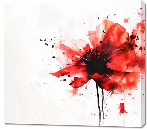 Obraz z serii abstrakcja zatytułowany Płynna Akwarela. Na obrazie przedstawiony jest kwiat w stylu akwarelowym, z dominującą czerwoną paletą barw, która przechodzi w mocne akcenty czerni w centrum kwiatu. Obraz ma dynamiczny i spontaniczny charakter, co podkreślają rozbryzgi i krople farby rozchodzące się wokół kwiatu. Przypomina to efekt plamy, który dodaje kompozycji artystycznego wyrazu i energii. Kontrast między delikatnymi czerwieniami a głęboką czerń centrum kwiatu przyciąga wzrok i czyni obraz bardzo wyrazistym. Tło jest jasne z subtelnie zaznaczonymi plamami, co dodatkowo akcentuje dramatyzm i piękno przedstawionego kwiatu.