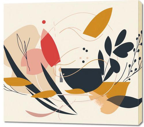 Obraz z serii minimalistyczne zatytułowany Porywista Flora. Grafika ta jest wizualnym poematem, łączącym abstrakcyjne formy z elementami botanicznymi. Ożywcze barwy, takie jak czerń, musztardowy żółty, głęboki pomarańcz i delikatny róż, mieszają się tworząc dynamiczną, ale harmonijną kompozycję. Wplecione w tło linie i kropki dodają ruchu, przywodząc na myśl taniec natury.Ten obraz doskonale udekoruje wnętrza w stylu mid-century modern, gdzie przytulne kolory i naturalne motywy są kluczowe. Jego energetyczna, ale spokojna paleta barw sprawi, że znajdzie swoje miejsce zarówno w domowych gabinetach, jak i w przestrzeniach publicznych, takich jak kawiarnie czy salony spa, wprowadzając do nich poczucie spokoju i równowagi.