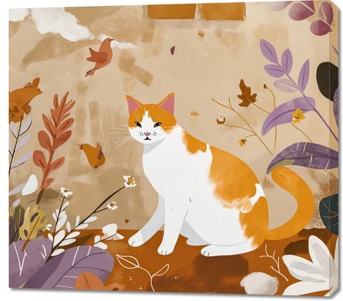 Obraz z serii abstrakcja zatytułowany Pospolita Krasa. Prezentuje on biało-rudego kota o bystrym spojrzeniu, wtapiającego się w pastelowy krajobraz pełen delikatnych kwiatów i latających ptaków. Jego łagodna postawa i miękkość linii kontrastują z żywiołowym tłem, dodając mu charakteru i głębi. Scena ta sprawdzi się w przestrzeniach, gdzie chcemy dodać odrobiny spokoju i natury, jak salony, pokoje relaksu, a także jako element dekoracyjny w klinikach weterynaryjnych lub sklepach zoologicznych, podkreślając bliskość ze światem zwierząt.