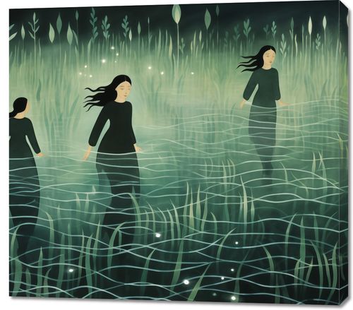 Obraz z serii wnętrza zatytułowany Pośród Ciszy, przedstawia grupę postaci kobiecych, poruszających się z gracją przez mglisty, oniryczny krajobraz. Zanurzone po kolana w wodzie, otoczone przez zielone, eteryczne trawy i dyskretnie świecące światła, postacie emanują spokojem i tajemniczością. Styl obrazu, z jego płynnymi liniami i spokojnymi odcieniami zieleni, tworzy uczucie medytacyjnej głębi i harmonii z naturą. Ten obraz idealnie nadaje się do wnętrz, które pragną odzwierciedlić głęboką spokojność i introspekcję, takich jak pokoje medytacyjne, strefy relaksu, domowe biblioteki, a także jako subtelny akcent w przestrzeniach publicznych, gdzie zachęca do chwili wytchnienia i refleksji.