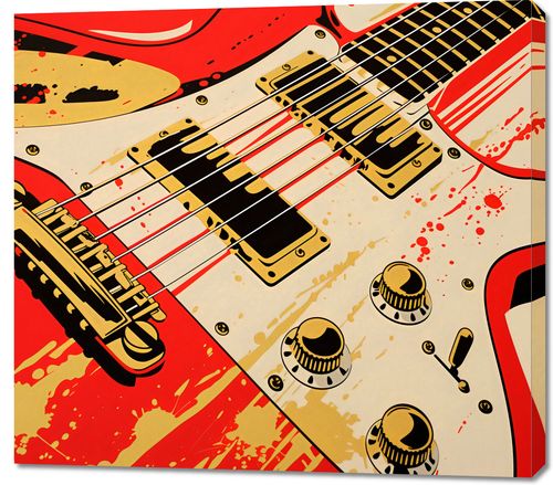 Obraz z serii abstrakcja zatytułowany Przed Graniem. Przedstawia zbliżenie na czerwoną gitarę elektryczną, której design jest wyrazisty i pełen energii. Widać detale instrumentu, takie jak przetworniki, potencjometry i struny, które są wyraźnie zaznaczone kontrastującymi kolorami złota, czerni i bieli na tle intensywnej czerwieni. Rozpryski i plamy farby na korpusie gitary nadają plakatowi surowy, rockowy charakter, co może sugerować żywiołowość i pasję muzyki granej na tym instrumencie. Ten obraz mógłby być atrakcyjnym elementem dekoracyjnym w przestrzeniach dedykowanych muzyce, takich jak sale prób, studia nagraniowe, pokoje młodzieżowe lub jako odważny akcent w nowoczesnym salonie.