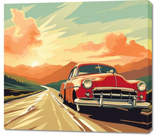 Obraz z serii pop art zatytułowany Przygoda Czeka. Ilustracja przedstawia klasyczny czerwony samochód z lat 50-tych, który wyrusza w podróż wzdłuż malowniczej, pustej drogi prowadzącej ku zachodzącemu słońcu. Dramatyczne chmury i rozświetlone niebo tworzą tło dla tego zapierającego dech w piersiach krajobrazu. Sceneria jest nasączona barwami zachodu słońca, od ciepłych żółci po głębokie pomarańcze, tworząc poczucie przygody i niekończących się możliwości. Obraz ten doskonale sprawdzi się w stylowym salonie, biurze, a nawet w garażu entuzjasty klasycznych samochodów, inspirując do marzeń o podróży i odkrywaniu nowych miejsc.