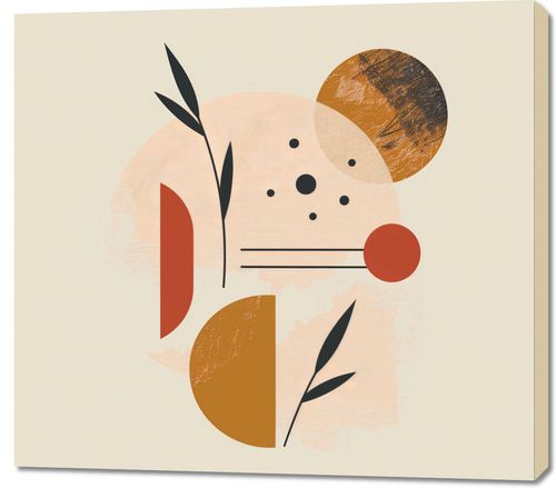 Obraz z serii boho zatytułowany Przyrost do Tła.Obraz przedstawia abstrakcyjną kompozycję złożoną z prostych, geometrycznych form i roślinnych motywów. Dominują tutaj ciepłe odcienie pomarańczowego, różu i brązu, które mieszają się z czernią i beżem. Na pierwszym planie mamy elementy roślinne, które mogą przypominać liście lub gałązki, zaś w tle znajdują się różnej wielkości i faktury koła. Całość jest stylizowana i uproszczona, co daje efekt współczesnego, designerskiego dzieła sztuki. Plakat może inspirować poczuciem spokoju i natury, jednocześnie zachowując modernistyczne uczucie. Idealnie wpasuje się w nowoczesne wnętrze jako centralny punkt dekoracyjny lub delikatne uzupełnienie estetyczne.