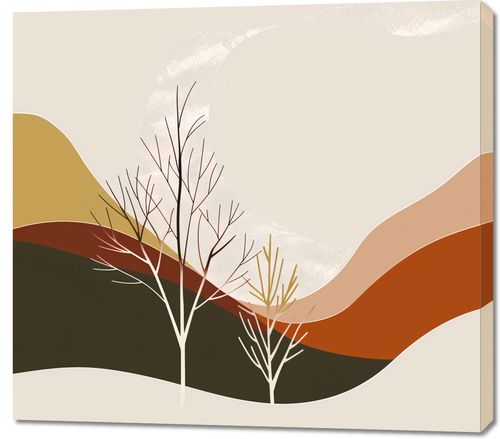 Obraz z serii minimalistyczne zatytułowany Pustynia Widzi. Obraz ukazuje dwie subtelne, ogołocone z liści drzewa, które wyłaniają się z miękkich, falujących form pustynnych wydm. Barwy są stonowane, z dominującymi odcieniami brązu, beżu i terakoty, co oddaje ciepłą i suchą atmosferę pustyni. Tło zawiera tekstury, które mogą przypominać piasek lub delikatną gęstwinę. Ten obraz doskonale sprawdzi się jako dodatek do wnętrz w stylu natur, dodając im ziemiściej palety i przywołując poczucie spokoju oraz prostoty. Będzie się dobrze komponować w przestrzeniach takich jak salon, pokój relaksu, a nawet biuro, wprowadzając elementy spokojnego krajobrazu, które mogą inspirować i uspokajać.